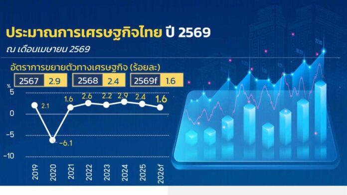 เศรษฐกิจไทยปี 2569 มีแนวโน้มขยายตัวที่ร้อยละ 1.6 แม้เผชิญแรงกดดันจากภูมิรัฐศาสตร์โลกและราคาพลังงาน กระทรวงการคลังย้ำเสถียรภาพยังแข็งแกร่ง พร้อมเดินหน้านโยบายการคลังเชิงรุกเพื่อรักษาระดับการเติบโตและบรรเทาผลกระทบต่อประชาชน